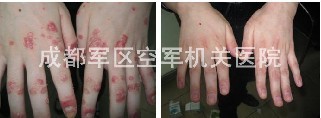 发病过程:患者有家族史,患病三年,于三年前的冬季病发,诱因不明。手部皮损严重,双手面部和手指顶部呈脓疱状。用过各种偏方,均无效果,手指顶部的脓疱加重。经朋友介绍求治于我院周少华医师。 |