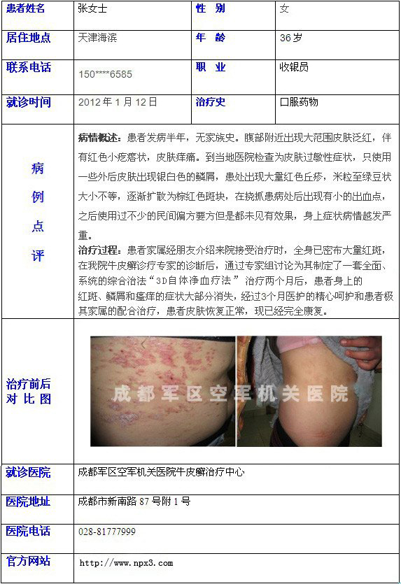 牛皮癣是一种常见多发的慢性皮肤炎症性疾病,病因复杂,极易反复,治疗难度大。成都军区空军机关医院牛皮癣治疗科室,采用诊疗技术——3D自体净血疗法,为更好服务于广大牛皮癣患者,治疗科室特推出"在线咨询预约"服务,为广大患者提供一个优质咨询平台。