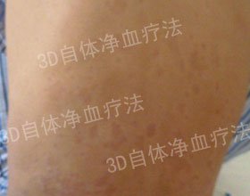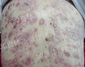 发病过程: 患银屑病长达8年。初始,头部和四肢有点状丘疹,皮损情况不严重,罗先生也没太在意,只是去家附近的医院开了一些外用药膏擦拭,病情稍有好转,但皮损红疹一直没有完全消除。直到2009年秋天,病症突然呈现迅速发展的趋势,大范围爆发,全身大面积出现红色斑块,伴有白色鳞屑脱落,并且瘙痒难耐。患病期间,罗先生辗转北京、上海各大医院,可是银屑病一直没有完全治愈,病情很反复。今年11月,罗先生在亲戚的介绍下,来到了我院就诊。 治疗概述: 我院医生综合患者各项检测结果进行分析,诊断患者为:寻常型银屑病进行期。皮肤过敏性检测显示罗先生的体质属于过敏性体质。 医生根据他的这个情况,针对性的制定了治疗方案,使用“3D自体净血疗法”中的自体净血技术进行治疗,2个疗程后罗先生的皮损几乎全部消褪。医生说:银屑病属于免疫介导疾病。传统疗法只是想办法压下皮损,短期内有效,但实际情况是皮肤之下的免疫系统出现问题。3D自体净血疗法中的易感基因自体修复技术正弥补了这上面的不足。 罗先生已经康复出院,目前已完全康复,没有复发。