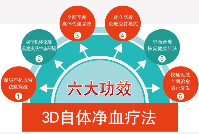 自体净血疗法综合西医分子基因学、组织病理学、纳米药理学、生物物理学、分子免疫学、医学心理学等多门基础学科,结合中医辩证论治理论、中药药理学等传统医学精髓,根据世界卫生组织(WHO)银屑病诊疗规范建立起来的多维康复工程。包括6大权威检测、6大权威治疗技术、15项核心技术和超百项辅助技术构成,以领先世界的多维方式,全面诠释银屑病的病因机制和治疗过程,使银屑病康复比率大大提高,疗效更加明显、安全可靠!3D自体净血疗法突破传统银屑病治疗疗程长、不彻底、易复发等技术瓶颈,实现了银屑病诊疗彻底、高效的医学奇迹。