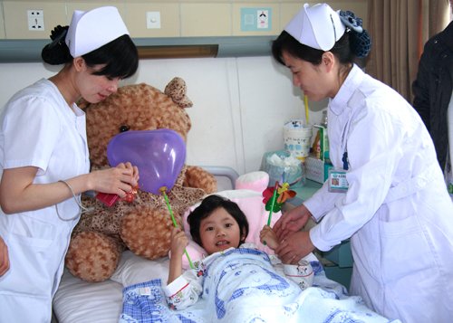 “阿姨,谢谢你们送我的气球,真好玩”,“叔叔,谢谢你们送我的漂亮风车”;“谢谢护士姐姐送我的糖糖”……这是2013年6月1日上午,发生在医院儿童病房里“健康关爱,欢度六一”活动的情景。