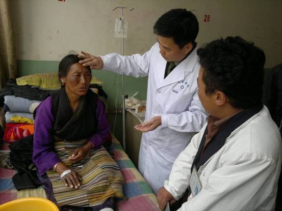 5 月28日, 我院特别组织了由资深皮肤病医生和其他医护人员等10 人组成的医生医疗队,赴藏区医院推广银屑病治疗先进技术,并进行高原地区银屑病科研攻关。医疗小分队根据藏区特殊的地理、气候、社会环境等实际情况,探讨藏区银屑病设备安装和技术运用操作难点,探讨适合高原条件的银屑病诊疗方案。医院的医生和藏区的医护人员夜以继日地开展病患会诊、学术研究,手把手帮扶施援。进藏一个多月,治愈患者40余例子,在当地引起了强烈反响。官兵们说:“武警医院的医生把‘3D自体净血疗法’和先进的设备与技术引进青藏高原,全面提升了藏区医院的医疗水平,为驻藏官兵和广大的高原人民带来了福音。”