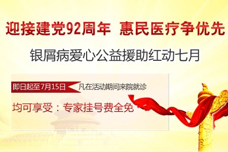 为庆祝中国共产党成立九十二周年,营造健康、和谐、积极向上的医院文化氛围,打造一个军拥民,民拥军,军民鱼水一家亲的良好医患关系。值此七一建党节来临之际,成都军区空军机关医院银屑病科诊疗中心为了回馈广大百姓,使更多的牛皮癣患者能够早日摆脱疾病的困扰,举办了“关爱牛皮癣患者,同享军民鱼水情”的大型优惠活动。
